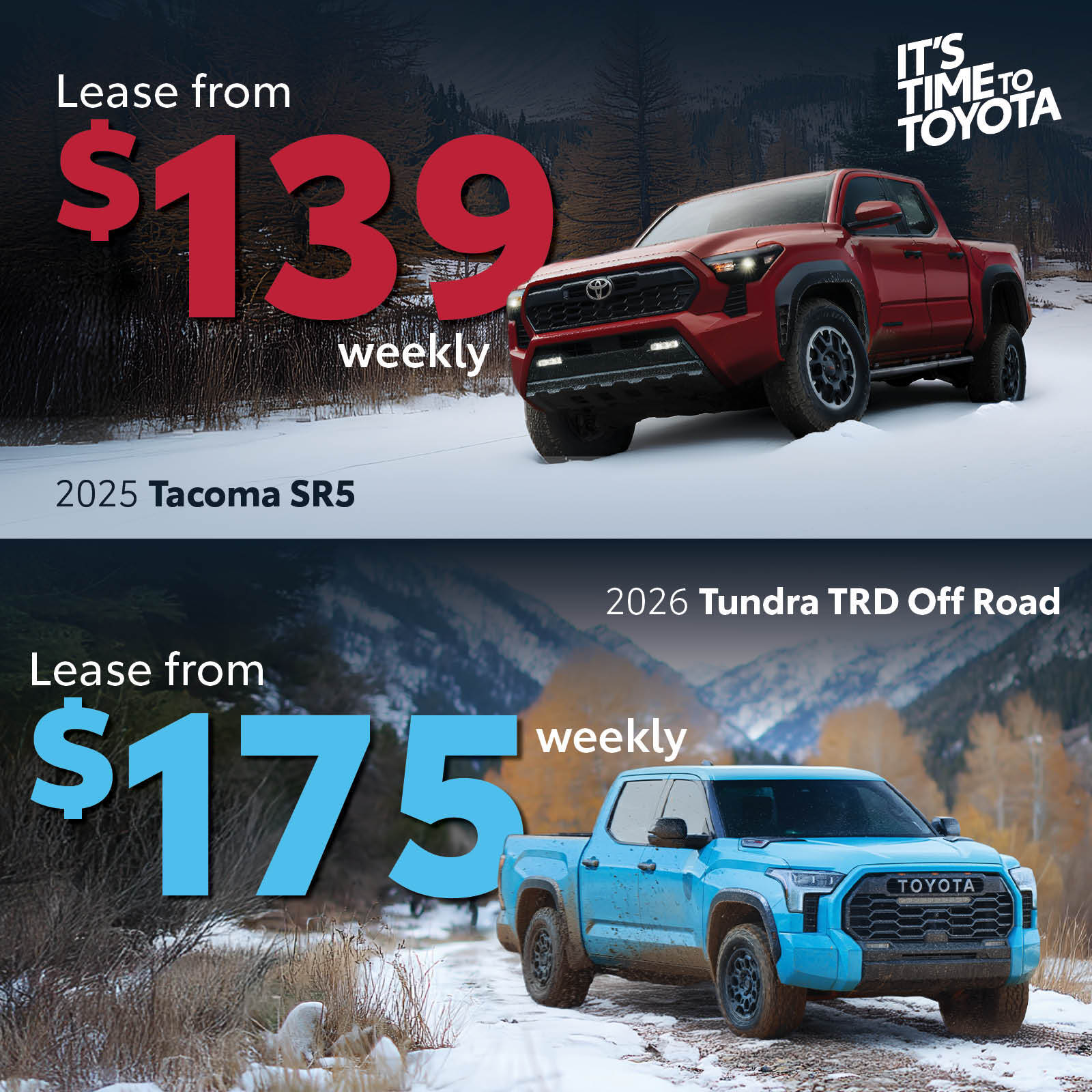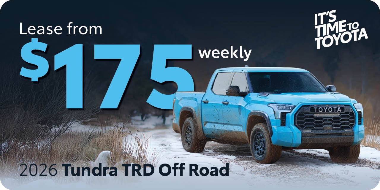 AMVIC Licensed Business. Vehicle is for illustrative purposes only and does not represent actual vehicle for sale. Vehicles available on a first-come first-serve basis. Offers available OAC and customers may not qualify for all incentives. $134 weekly applies to 2025 Tacoma TRD SR5 – STK#25TA0115, leased at 5.59% for 64M stretch, SP $54,390.75, 1st Payment Due, Total Lease Obligation $69,951.60, Residual Value $24,517.00. 20,000km/year allowance, excess km charges apply at 0.12cent/km.$175 weekly applies to 2026 Tundra TRD Off Road- STK#26TU4960, leased at 3.99% for 60M, SP $71,190.75, 1st payment due, Total Lease obligation $93,091.80, Residual Value $30212.80. 20,000km/yr allowance, excess km charges apply at 0.12cent/km. Some conditions apply. See dealer for details. Subject to change without notice. Offers expire November 30th, 2025.
